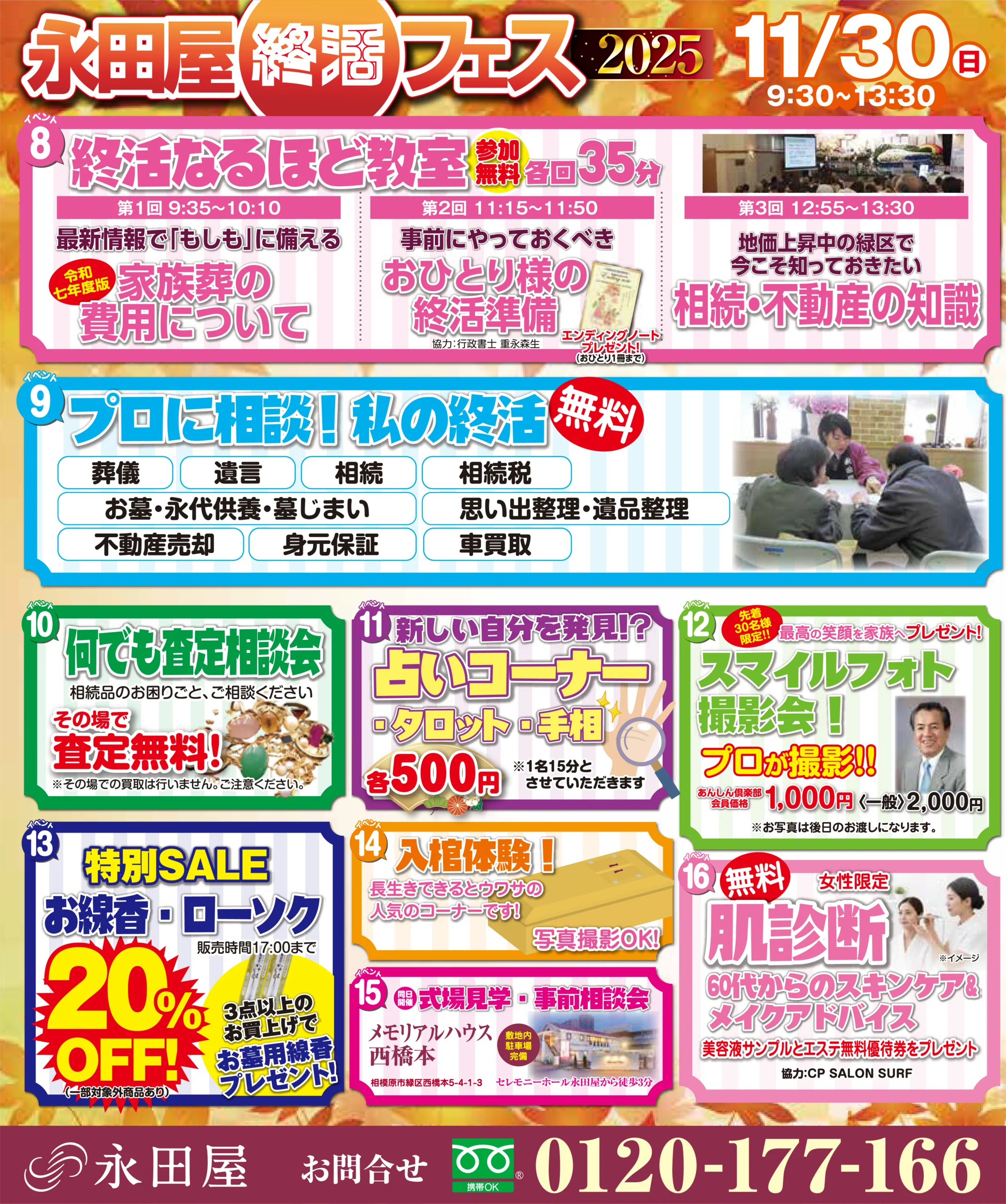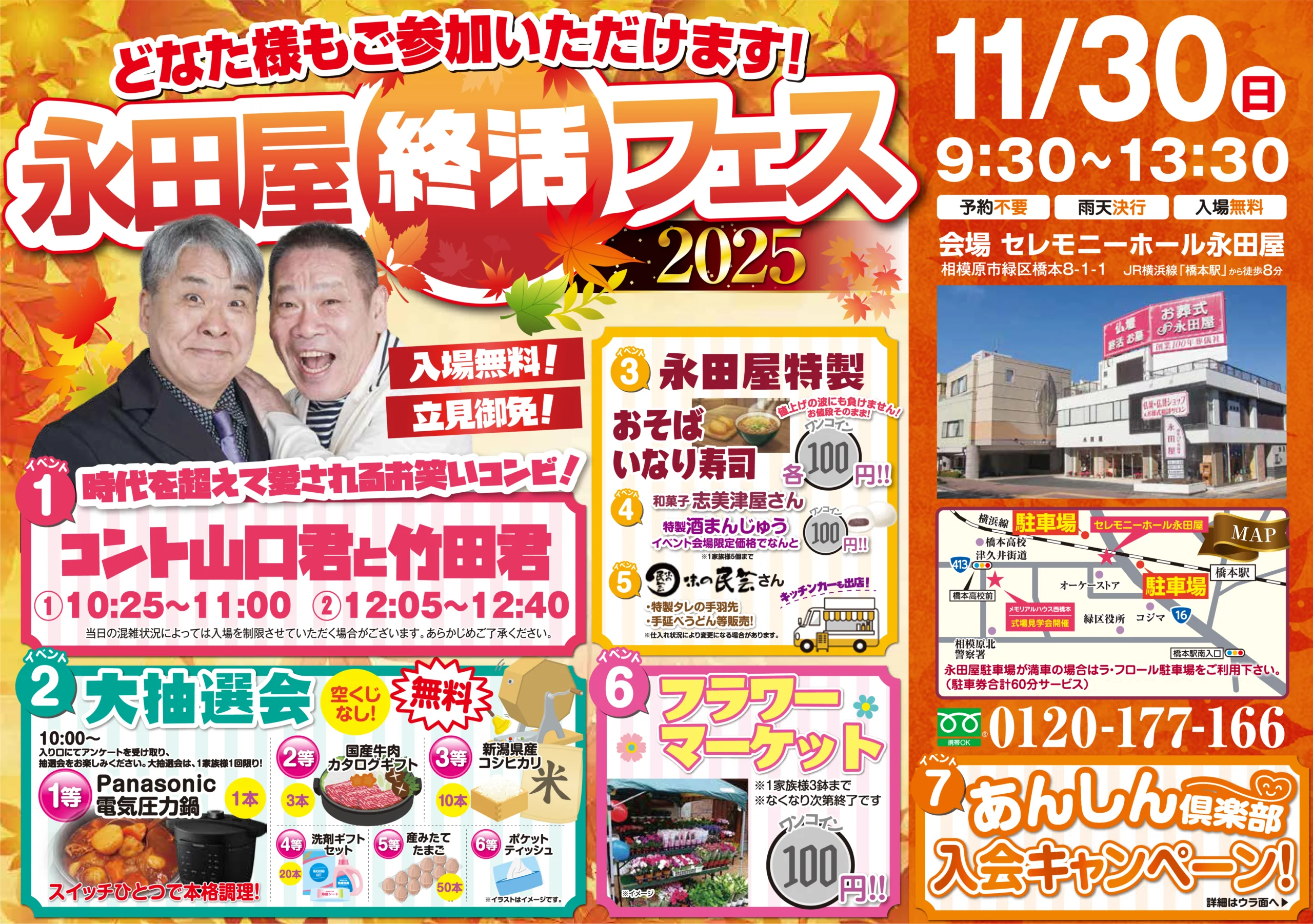 毎年沢山のかたが参加してくださる、周年祭。今年は「終活フェス」と題して、11月30日(日)に決定いたしました!100円お蕎麦やいなり寿司、大人気!志美津屋さんの酒まんじゅうも100円✨✨