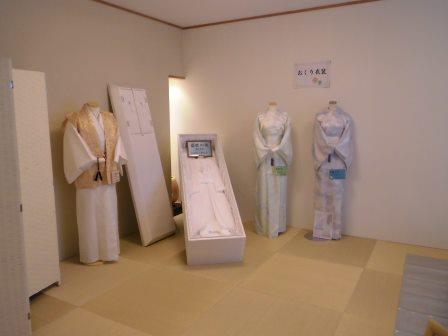 お棺と仏衣の展示もしました。隣では入棺体験コーナーも行っています。