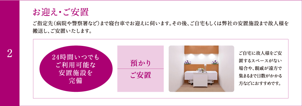 全ての直営式場に「面会可能な個室型安置ルーム」を完備しております。ご要望に合わせてご希望の式場をご案内させていただきます。