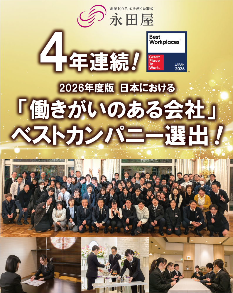 永田屋はこれからも「三方良し」を追求し、社員一人ひとりが誇りを持って「もうひとりの家族」としてお客様を支えられる環境を整えてまいります。働きがいの向上を通じて、地域社会に必要とされ続ける企業を目指します。